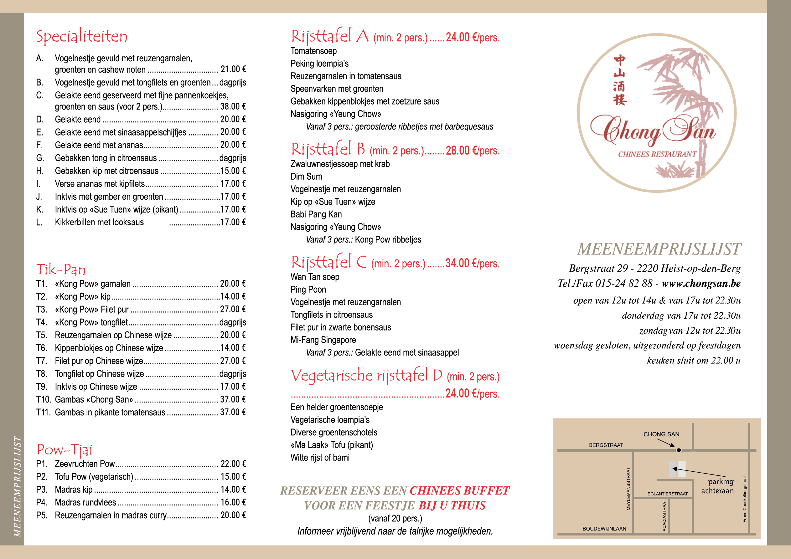 Bij Chong San dineert u gezellig en aangenaam in het hartje van Heist-op-den-Berg. Chong (中) betekent trouwens 'midden' terwijl San (山) staat voor 'berg'. Het is geen toeval dat Chong San gelegen is in het midden van de Heistse winkelstraat: Bergstraat.